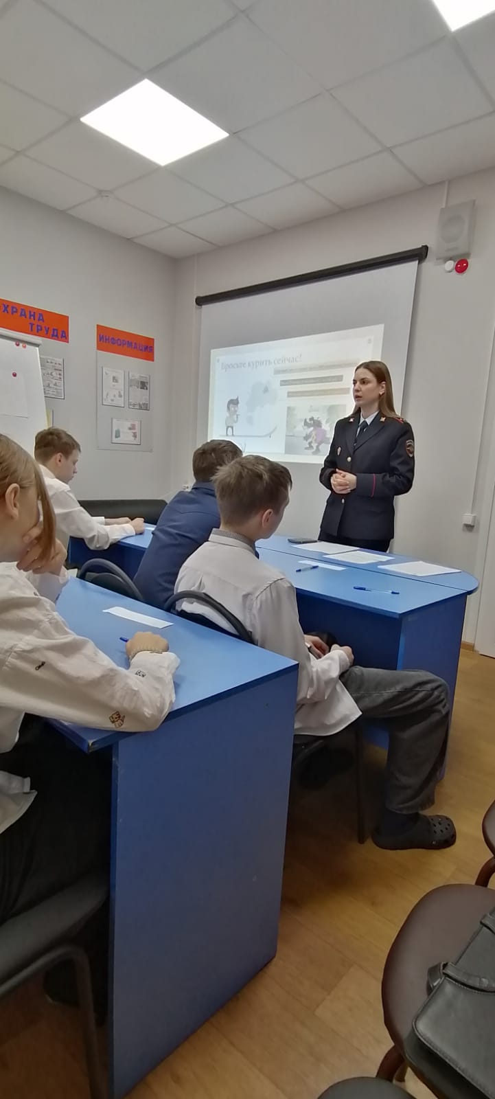 «Профилактические меры, связанные с курением табака несовершеннолетними, помогут предотвратить проблему прежде, чем она появится. Именно правильно подобранные методы помогают убедить подростка в том, что курение сигарет или «вейпов» несовершеннолетним не приносит для него пользы. Продажа сигарет несовершеннолетним строго запрещена законом. Электронные сигареты привлекательны для детей и подростков своим вкусом и ароматом, имитирующим запах и вкус натуральных продуктов. К тому же среди подростков бытует ошибочное мнение, что они не приносят вреда здоровью. Никотин, содержащийся в электронных сигаретах, обладает ничуть не менее вредным воздействием, чем в традиционных табачных изделиях. Он пагубно влияет не только на общее состояние организма, но также на умственную активность подростков». Приглашенный на занятие инспектор ПДН МО МВД России «Рубцовский» Ирина Сергеевна, ещё раз напомнила подросткам о том, что курение, в том числе электронных сигарет нарушает не только устав общеобразовательного учреждения, но и влечет за собой административную ответственность.