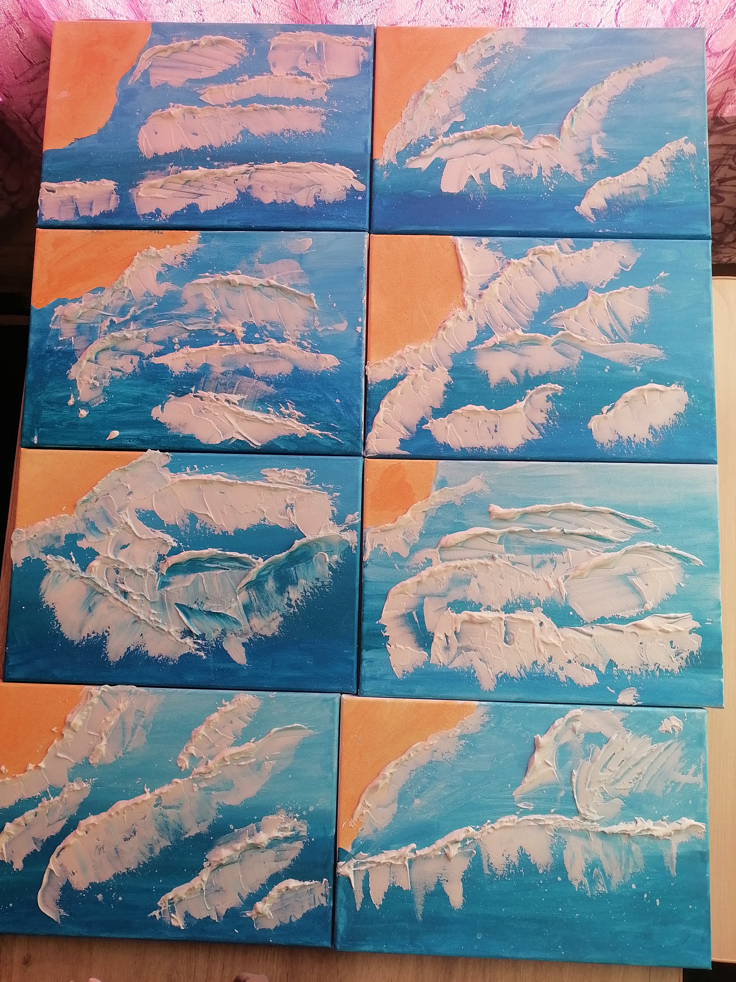Ребята выполняли работу на холстах, рисовали море и морской берег, используя акриловые краски. А затем рельефной пастой изображали объемные волны.